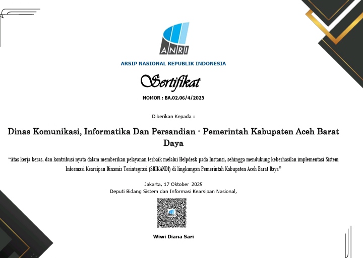 BLANGPIDIE, ACEHGLOBALNEWS.com – Dinas Komunikasi, Informatika dan Persandian (Diskominsa) Kabupaten Aceh Barat Daya (Abdya) menerima sertifikat penghargaan dari Arsip Nasional Republik Indonesia (ANRI).