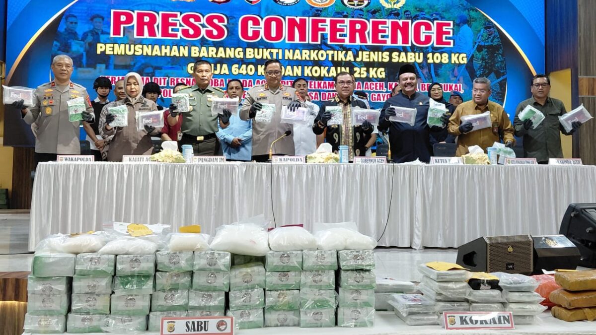 Banda Aceh, Acehglobal – Kepolisian Daerah (Polda) Aceh bersama sejumlah instansi terkait menggelar konferensi pers pemusnahan barang bukti narkotika pada Kamis (12/6/2025), di Banda Aceh.