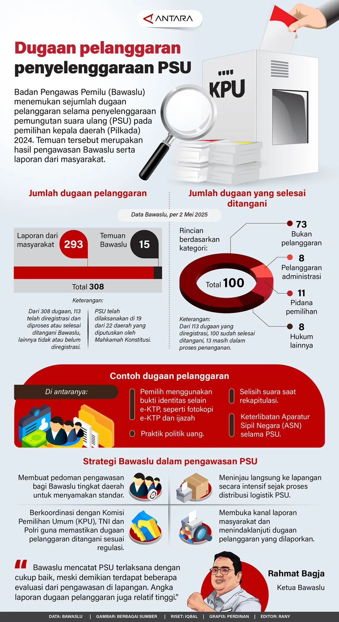 Sementara itu, dia mengatakan bahwa sebanyak 82 persen dari 308 laporan dugaan pelanggaran selama PSU Pilkada 2024 telah selesai ditangani, sedangkan yang masih diproses berjumlah 18 persen.