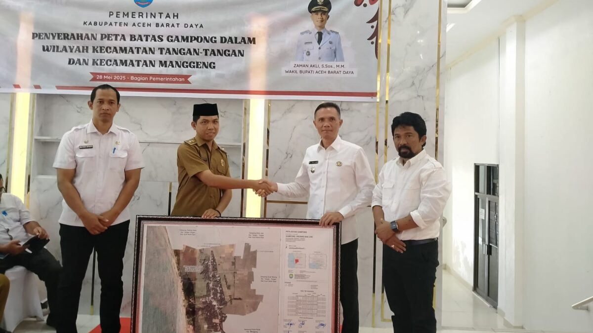 Penyerahan Peta batas desa itu diserahkan langsung oleh Wakil Bupati Abdya /wabup-zaman-akli-resmi-lepas-keberangkatan-64-jemaah-calon-haji-abdya/" target="_blank" rel="noopener">Zaman Akli disaksikan Sekda Abdya, Rahwadi, Plt Asisten III Setdakab Abdya, Rizal, unsur Forkompinkab dan pejabat terkait lainnya yang berlangsung di Lobi Kantor Bupati Abdya, Rabu (28/5/2025).