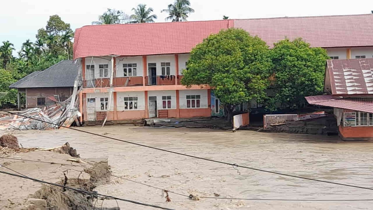 “Kondisi sekolah kami saat ini sangat parah. Tanah di sekitar bangunan sudah terkikis, aliran sungai terpecah dan membentuk jalur baru yang tepat mengarah ke sekolah,” ujarnya kepada , Senin (8/12/2025).