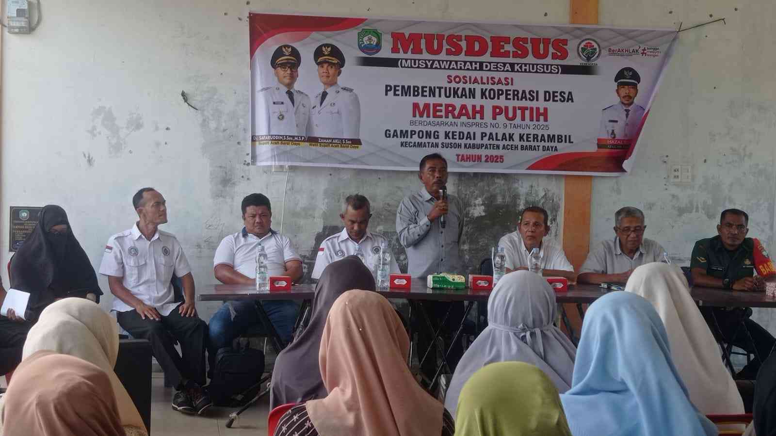 Blangpidie, Acehglobal – Pemerintah Desa Kedai Palak Kerambil, Kecamatan Susoh, Kabupaten Aceh Barat Daya (Abdya), resmi membentuk Koperasi Desa (/perdana-di-abdya-koperasi-merah-putih-durian-rampak-resmi-berbadan-hukum/" target="_blank" rel="noopener">KopDes) Merah Putih. Pembentukan dilakukan melalui /lewat-musdesus-gampong-ladang-neubok-abdya-resmi-dirikan-kopdes-merah-putih/" target="_blank" rel="noopener">Musyawarah Desa Khusus (Musdesus) yang berlangsung di aula kantor desa setempat, Rabu (21/5/2025).