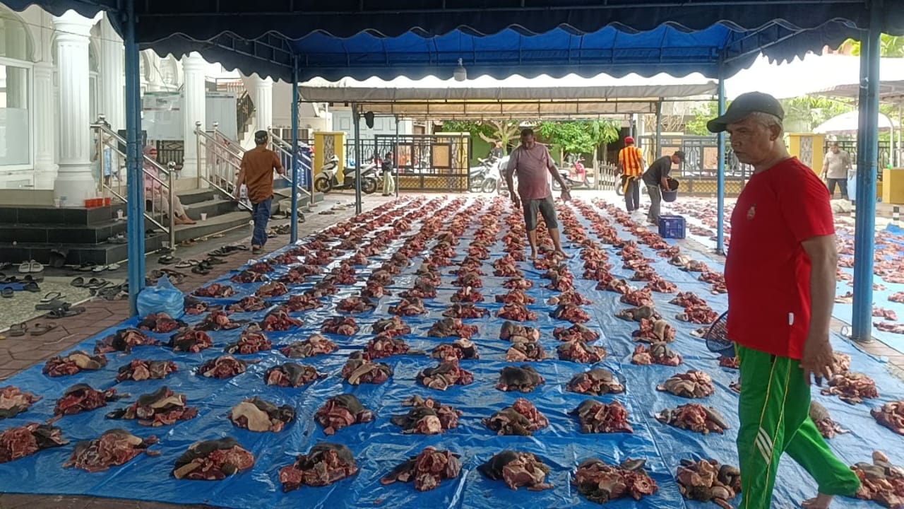 “Setelah disembelih oleh warga dengan sistem gotong royong, dagingnya langsung dibagikan kepada masyarakat yang berhak menerima dan mendapatkan satu paket daging lebih kurang seberat 2 kilogram,” katanya.