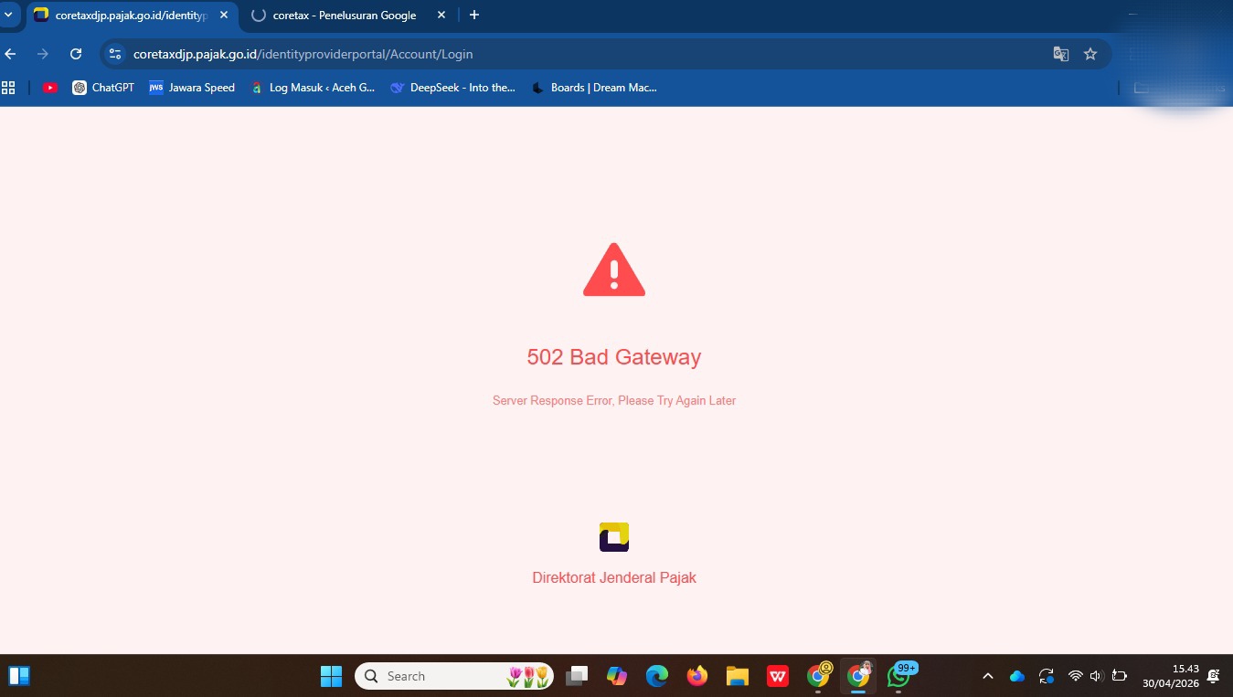 Namun, pantauan pada Kamis (30/4/2026) sekitar pukul 15.00 WIB, sistem Coretax tidak dapat diakses.