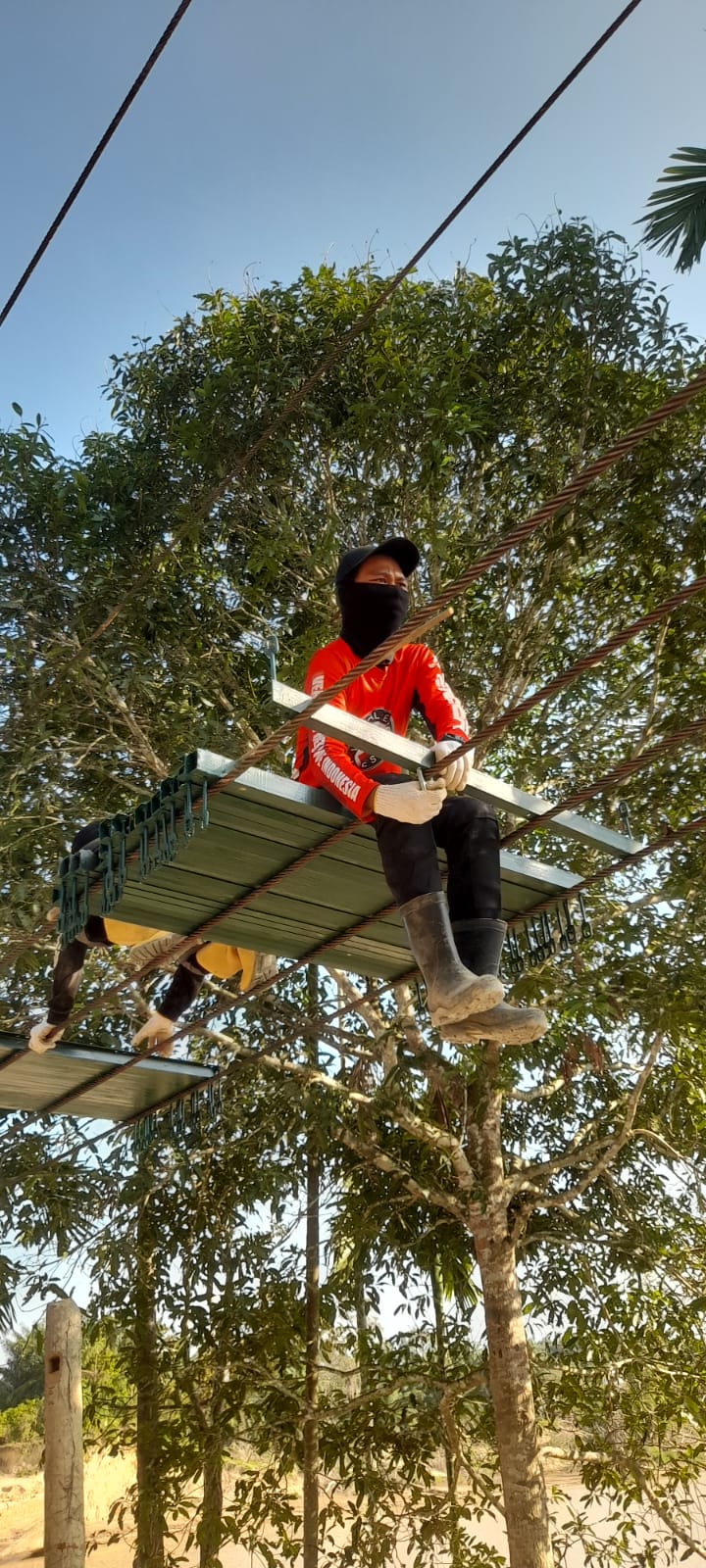 Adapun tahapan pekerjaan yang saat ini sedang dilaksanakan meliputi pemasangan gelagar memanjang, pemasangan besi palangan, pemasangan reling turunan, pemasangan seling rawaian, pemasangan papan pijakan, pemasangan ram kawat, serta pemasangan plang anjuran dan plang identitas jembatan yang dilanjutkan dengan proses pengecatan.