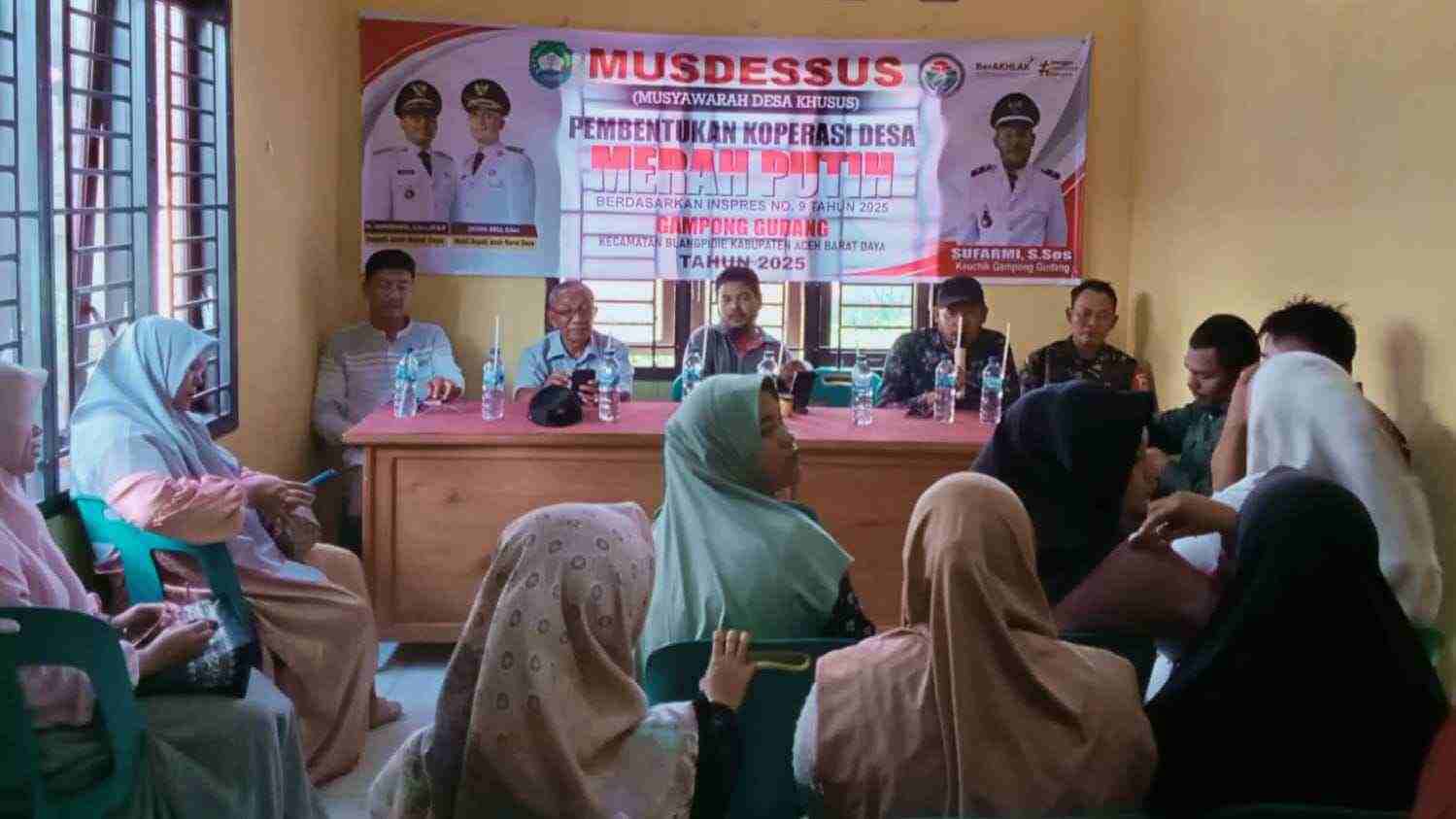 Blangpidie, Acehglobal – Pemerintah Gampong Gudang, Kecamatan Blangpidie, Kabupaten Aceh Barat Daya (Abdya), secara resmi membentuk /6-500-kop-des-merah-putih-di-aceh-terancam-tak-sesuai-qanun-lks/" target="_blank" rel="noopener">Koperasi Desa (KopDes) Merah Putih dalam Musyawarah Desa Khusus (Musdessus) yang digelar di kantor Keuchik Gampong setempat, pada Sabtu (17/5/2025).