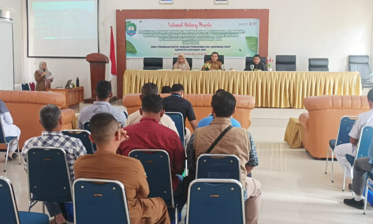 BLANGPIDIE, — Pemerintah Kabupaten Aceh Barat Daya (Pemkab Abdya) mensosialisasikan penataan hukum, pelaporan pembinaan dan pengawasan lingkungan hidup bagi para pelaku usaha yang berlangsung di Aula Bappeda, Senin (13/10/2025).