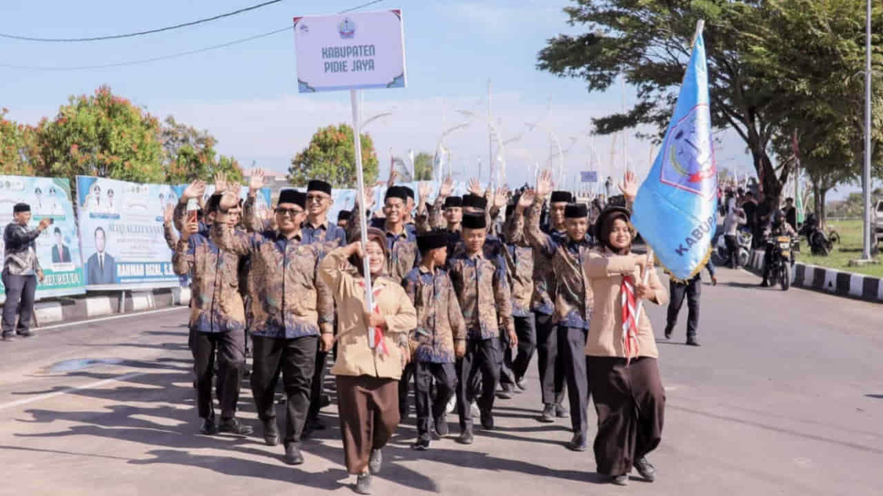 |Meureudu – Ribuan peserta dari 23 kafilah kabupaten/kota se-Aceh mengikuti pawai ta’aruf Musabaqah Tilawatil Qur’an (MTQ) Aceh ke-37 yang digelar di Kabupaten Pidie Jaya, Sabtu (1/11/2025).