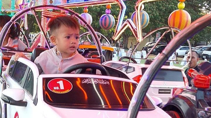Salah satu pengunjung cilik yang tampak sangat gembira adalah Muhammad Nabil Ramadhan, yang terlihat sedang asyik mengemudikan mobil Pajero Sport odong-odong berwarna putih.