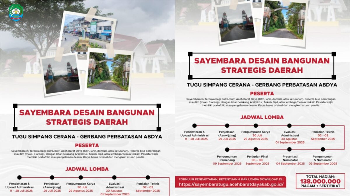 Sayembara ini dibagi dalam dua kategori, yakni Desain Tugu /wujudkan-ikon-baru-kota-pemkab-abdya-buka-sayembara-desain-tugu-simpang-cerana-dan-gerbang-perbatasan-kabupaten/" target="_blank" rel="noopener">Simpang Cerana di Kota Blangpidie dan Desain Gerbang Perbatasan Abdya dengan kabupaten tetangga.