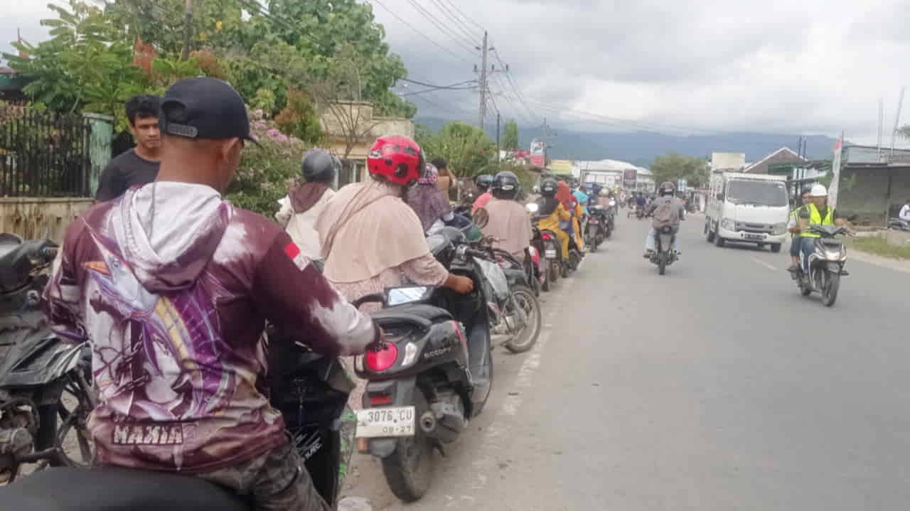 Antrean mobil terlihat sudah sampai ke Desa Kedai Siblah Kecamatan Blangpidie. Sementara antrean sepeda motor mencapai ratusan meter sampai titik kawasan SDN 1 Susoh.